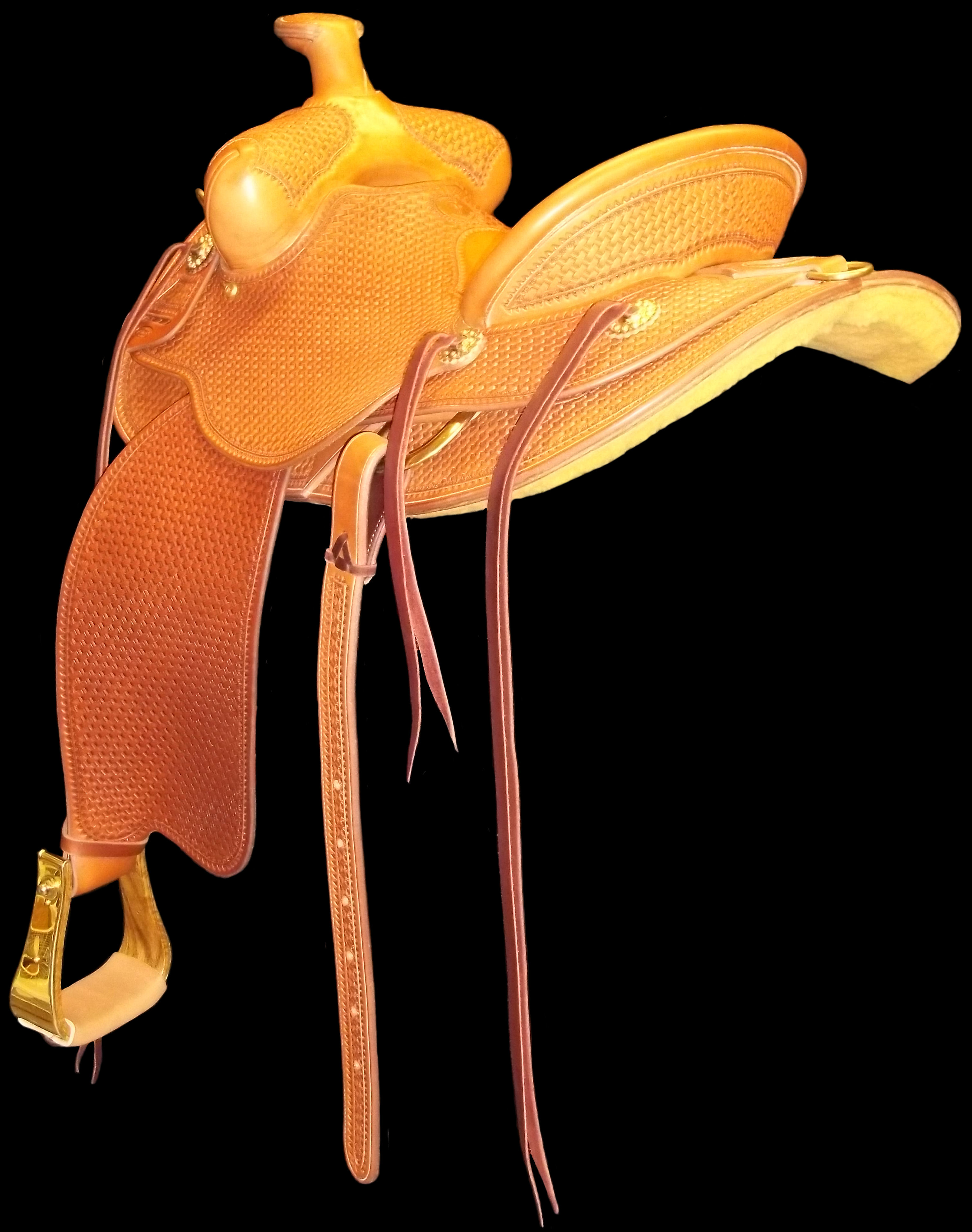 This is a full basket stamped saddle. It has round skirts with a 15/16 inskirt rigging. It has a straight up cantle that is bound with leather. The stirrup leathers have a nevada twist. The stirrups are 2 1/2" brass bound Bells.